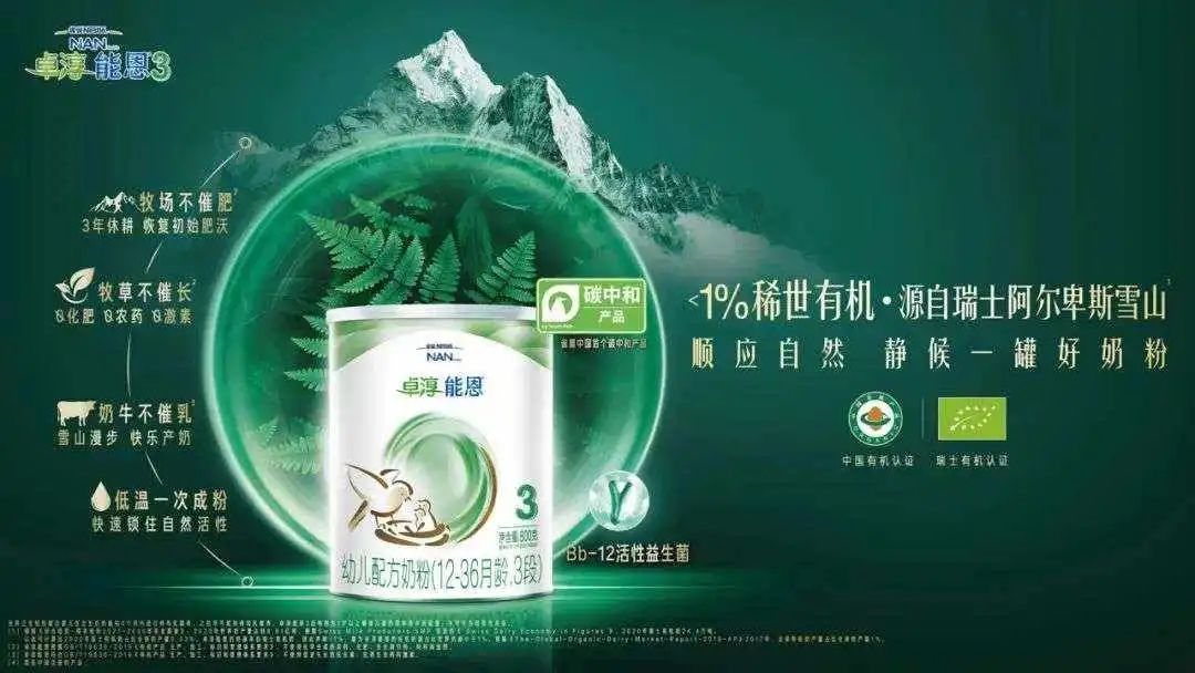 从上游源头保证奶源的健康可持续,6月17日,雀巢发布了其中国市场的首款碳中和产品——卓淳能恩3有机奶粉。该产品对全链路进行了碳足迹测算,奶源上坚持了牧草自然成熟不催长,此外在产品的盖与勺附件上,雀巢也采用了植物基材料。