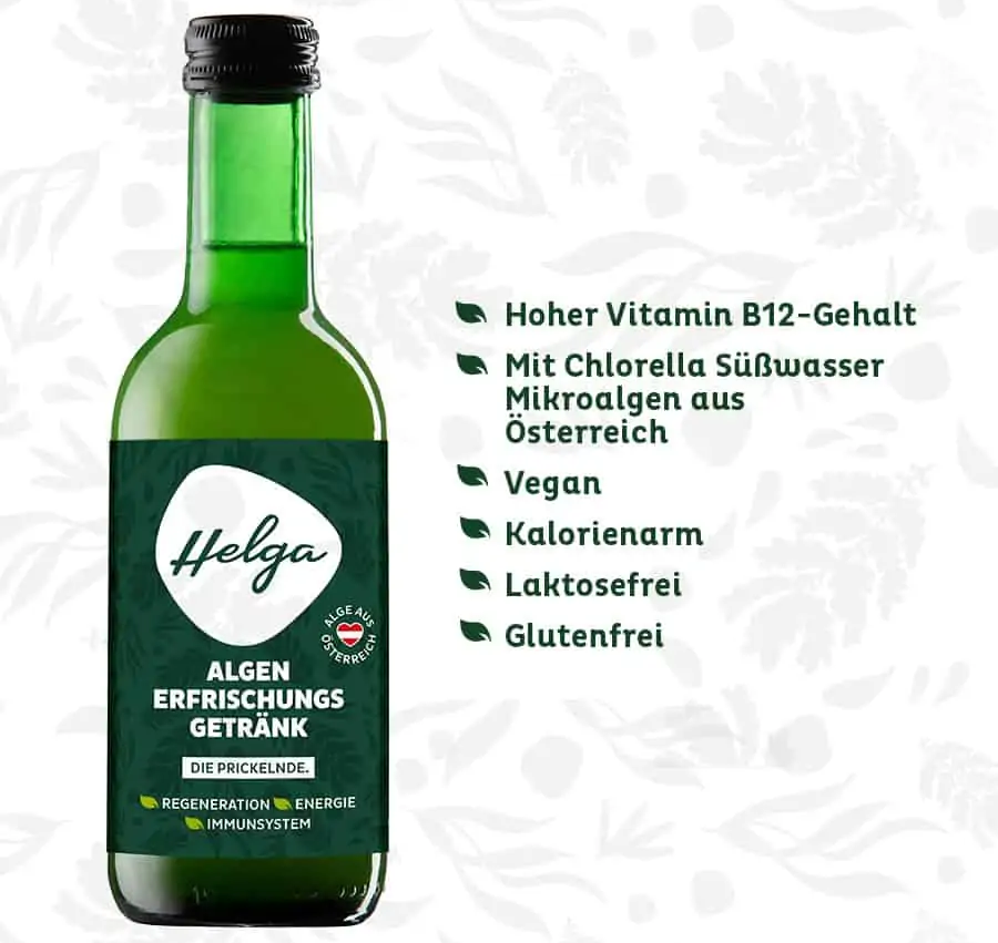 奥地利公司HELGA也是一家专注于藻类食品研发的初创公司。他们开发出两种藻类饮料(DIE PRICKELNDE HELGA和DIE STILLE HELGA)、两种藻类饼干(HELGA BIO ALGENCRACKER)和 100% 纯小球藻粉(HELGA CHLORELLA ALGENPULVER)。其中,以小球藻为主要原料的功能饮品DIE PRICKELNDE HELGA,是一款低热量的纯素提神饮料。产品中含有丰富的维生素B12,适合热爱运动,需要及时补充能量的人们。有机海藻饼干则由小球藻、全麦粉和亚麻籽等超级食物制成,同样营养丰富。
