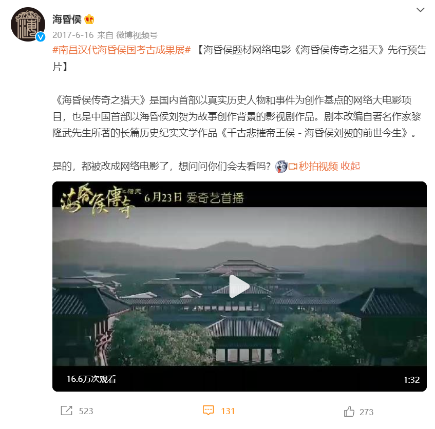 虽然该作品被官方列入“南昌汉代海昏侯国考古成果展”之中,但其文化价值与社会价值却值得打一个问号。作为网络电影,格调不高,质量差强人意,难以将海昏侯的历史风云、文化底蕴真正演绎出来,更难说有提升海昏侯博物馆文化知名度的效果。