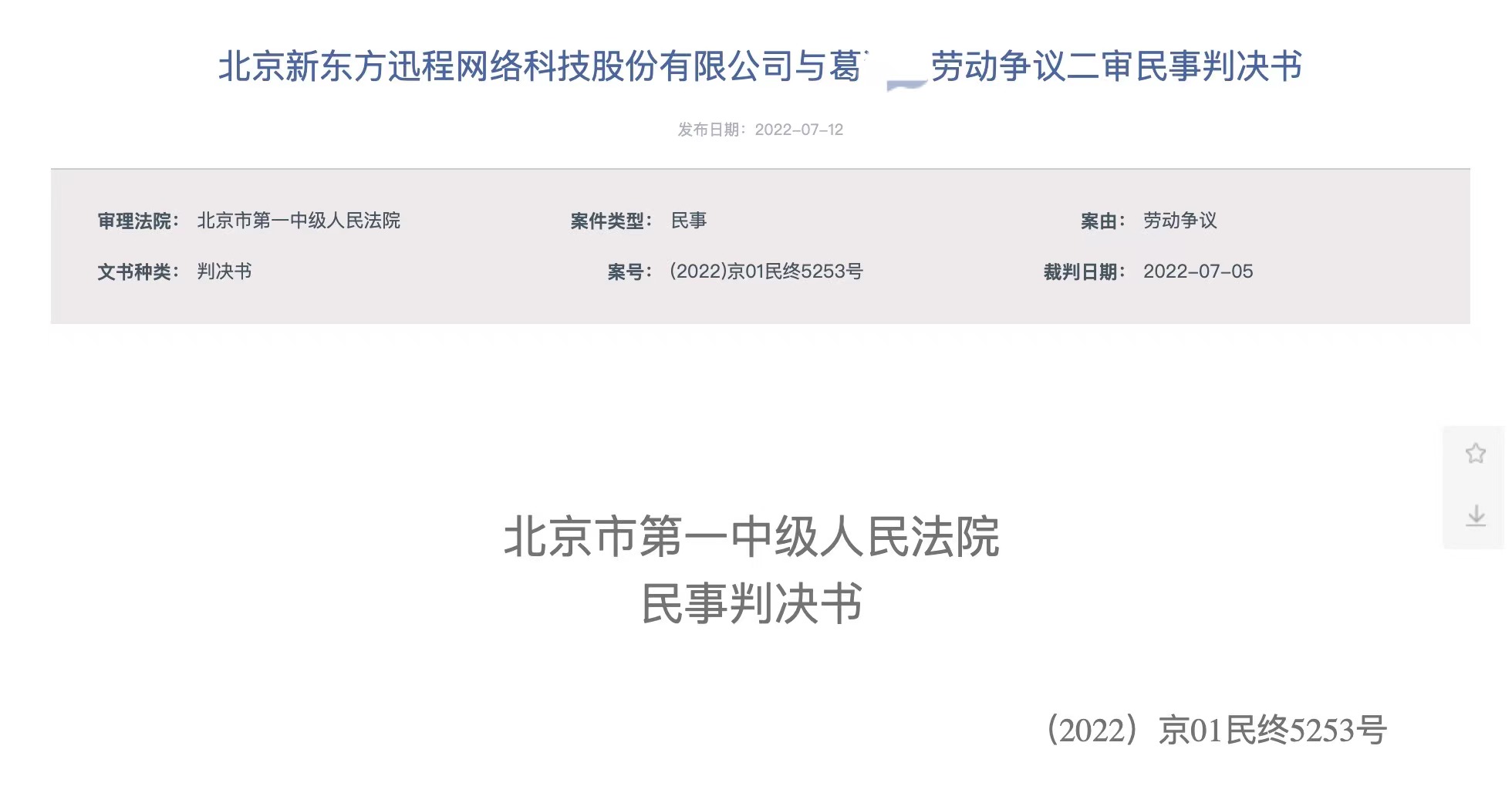 7月12日,北京法院审判信息网公开北京新东方迅程网络科技股份有限公司与葛某劳动争议二审民事判决书。审理法院为北京市第一中级人民法院。