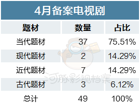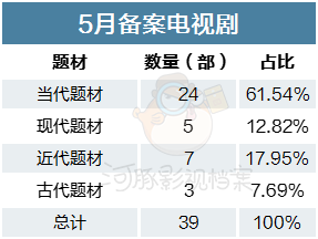 在题材方面,4月与5月在近代与古代题材上数量相等,两者备案总数差距来源主要是5月当代题材数量的锐减,从4月的37部降至5月的24部,另外都市、军旅、农村等题材均有下降,其中4月出现的当代青少题材,在5月则未出现。