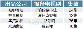 广电总局发布的备案数据显示,4月和5月的知名影视公司的身影有所减少,哇唧唧哇、芒果影视、华策影视、欢瑞世纪在这两个月分别报备了1部作品,分别为《偷偷藏不住》《夏日奇妙书》《一路朝阳》和《莲花楼》。