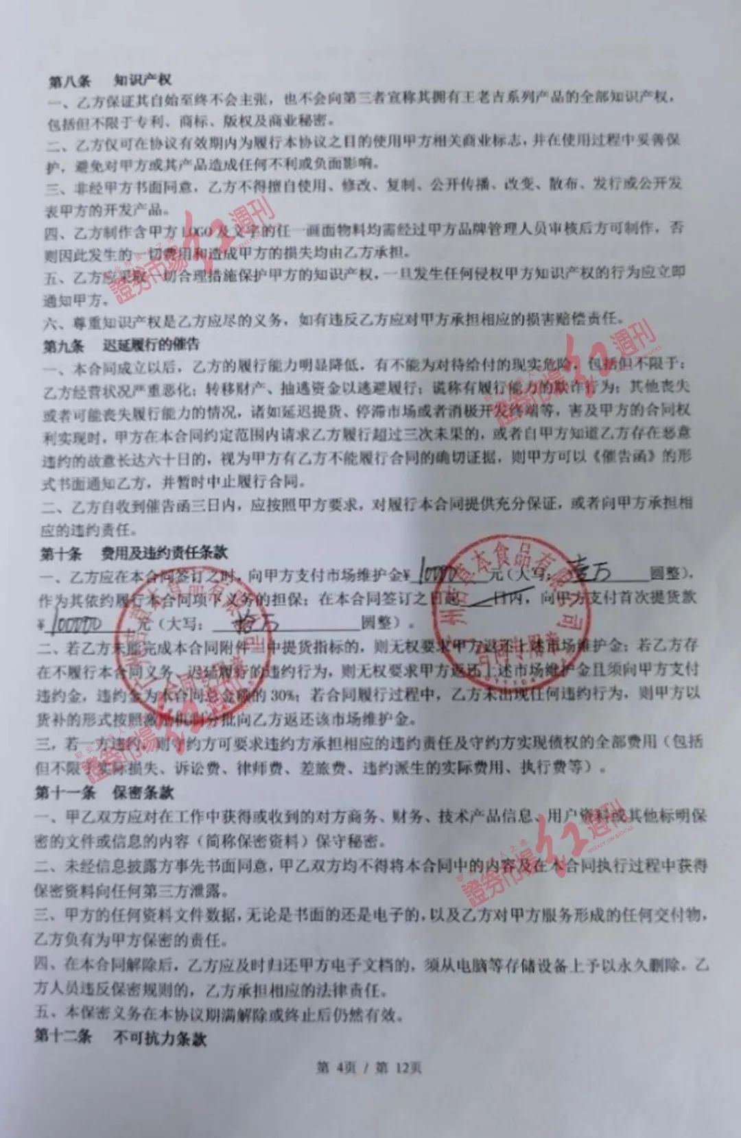 据相关代理商提供给《红周刊》的经销合同显示,如果代理商签约首年未完成约定的年度进货目标的80%,招商公司有权对代理商的合作条件作出调整,包括但不限于缩小经销区域、调整经销产品、按比例扣除合同市场维护金并取消代理商的经销资格,甚至可以终止合同。
