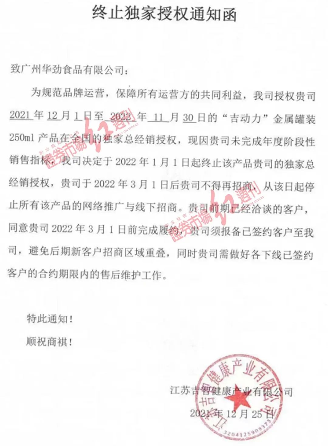 常壮壮给《红周刊》展示的一则通知函内容显示,广州华劲公司早在今年1月1日就终止了“吉动力”金属灌装产品的独家总经销授权,根据江苏吉智健康产业有限公司提供的通知函显示,广州华劲公司于2022年3月1日后不得再招商,并停止所有产品的网络推广与线下招商。