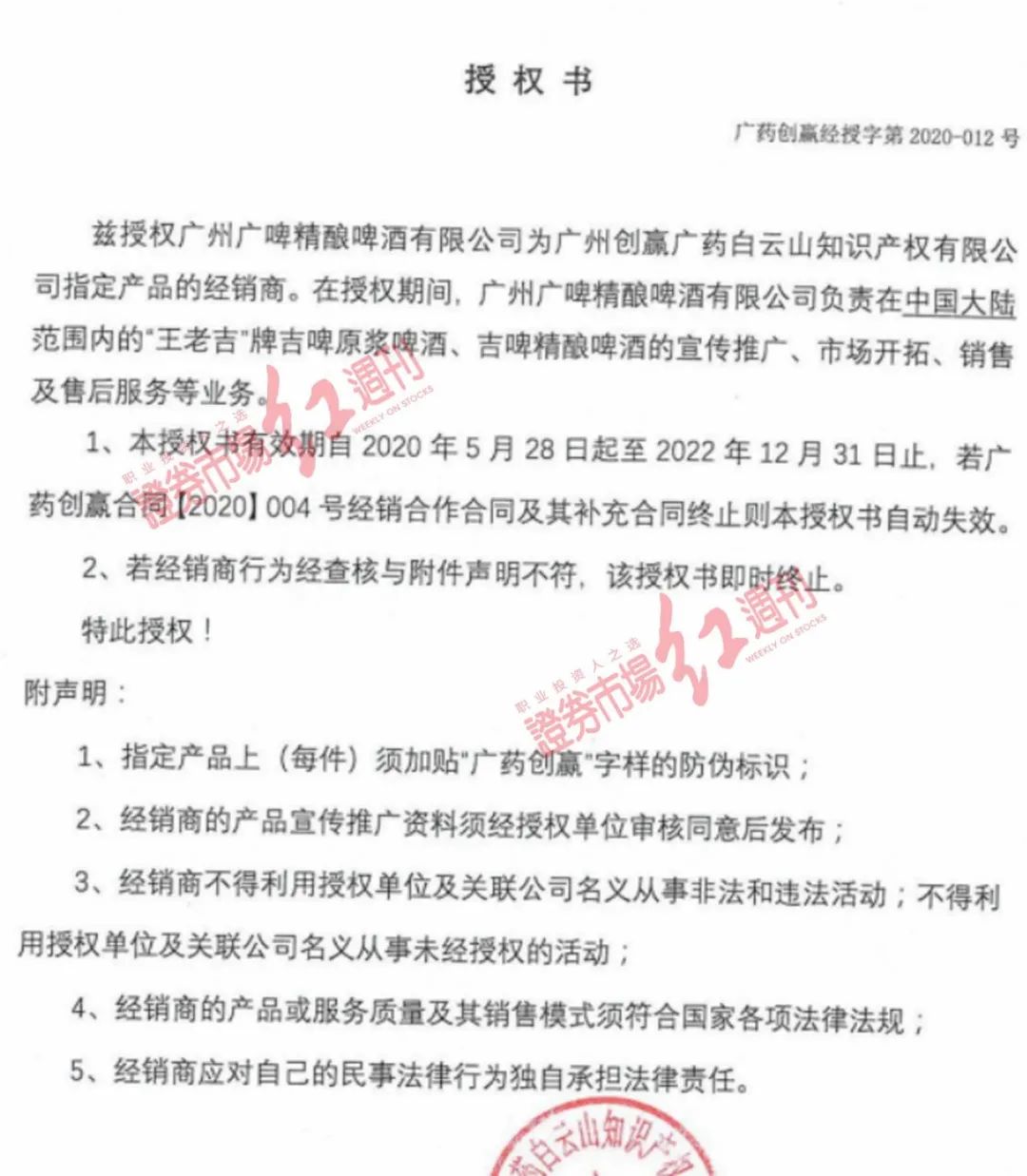 《红周刊》要求该招商人员展示他们的经营资质,并询问实际签约公司。该招商人员确认实际签约公司为广州广啤精酿啤酒有限公司(简称“广州广啤公司”),并提供了相关公司的营业执照、商标授权书、食品生产许可资格证,其中商标授权书的授权方赫然是广州创赢广药白云山知识产权有限公司。