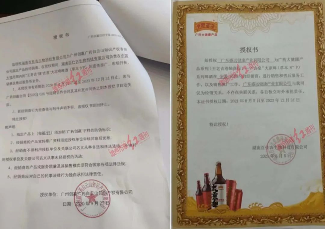 《红周刊》调查发现,这些招商公司的授权书确实出自“广药系”公司,并衍生出授权再授权的把戏。以江苏淮安周女士等人签约的广东盛远健康产业有限公司(简称“广东盛远公司”)为例,白云山的全资子公司广州创赢广药白云山知识产权有限公司(简称“广州创赢公司”)授权湖南百仕吉健康产业有限公司(简称“湖南百仕吉公司”)为其指定产品的代理商,在授权期间,湖南百仕吉公司负责“王老吉”牌“吉泉”大凉啤啤酒的宣传推广、市场开拓、销售及售后服务等业务。而湖南百仕吉公司又进一步将“王老吉”牌“吉泉”大凉啤啤酒授权给了广东盛远公司。