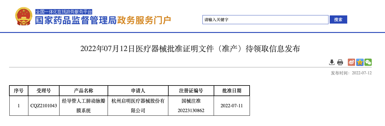 7月12日,国家药品监督管理局发布的医疗器械批准证明文件(准产)待领取信息显示,杭州启明医疗器械股份有限公司生产的产品“经导管人工肺动脉瓣膜系统”获批上市。