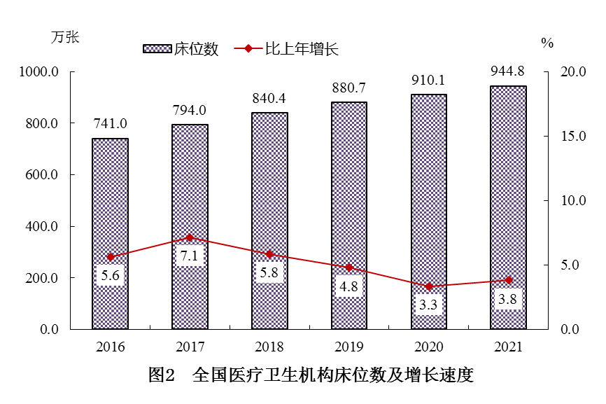 (二)床位数。2021年末,全国医疗卫生机构床位944.8万张,其中:医院741.3万张(占78.5%),基层医疗卫生机构171.2万张(占18.1%),专业公共卫生机构30.2万张(占3.2%)。医院中,公立医院床位占70.2%,民营医院床位占29.8%。与上年比较,床位增加34.8万张,其中:医院床位增加28.1万张(公立医院增加11.6万张,民营医院增加16.6万张),基层医疗卫生机构床位增加6.3万张,专业公共卫生机构床位增加0.6万张。每千人口医疗卫生机构床位数由2020年6.46张增加到2021年6.70张。