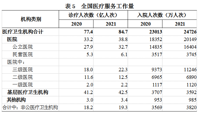 2021年,公立医院入院人次16404万(占医院总入院人次的81.4%),民营医院入院人次3745万(占医院总入院人次的18.6%)(见表5)。