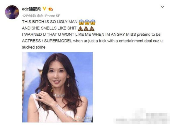 对此,陈冠希并没有做出解释,而是删除了言辞粗鄙的骂人微博,称:“为什么要骂她,她知道的,我早就警告过她。”