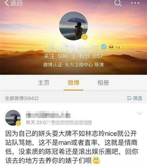 当天晚上,东方卫视某导演发微博指责陈冠希:“因为自己的姘头耍大牌不如林志玲nice就公开战队骂她,这不是man或者直率,这就是情商低,没素质的陈冠希还是滚出娱乐圈吧,回你该去的地方养你的婊子们呗。”随后,该导演删除了这条微博,称:“奇了怪了,一个曾经大红大紫的男明星在微博上公开辱骂一个女明星这事儿还做得对了?之前那条删了是因为语气确实过了点,但立场不会有变化,打心眼里看不起骂女人的男人。”