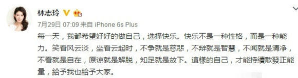 29日早上,林志玲发微博,似乎暗示自己已经原谅陈冠希的辱骂:“每一天,我都希望好好的做自己,选择快乐。快乐不是一种性格,而是一种能力。笑看风云淡,坐看云起时,不争就是慈悲,不辩就是智慧,不闻就是清净,不看就是自在,原谅就是解脱,知足就是放下。这样的自己,才能持续散发正能量,给予我也给予大家。”