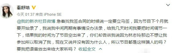 “《我的新衣》栏目急着找我签合同的时候说一定要立马签,因为节目下个月就要开始录了,我说我中间两期有事情没办法录,给我几天时间我要把时间调节一下,结果我的时间为了节目空出来了,你们却告诉我说因为林志玲那边不想让我参加所以取消了我,现在又说并没有因为什么人,所以节目都是这样骗人的吗?要我把语音放出来给大家听吗?”