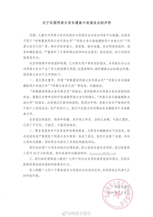 紧接着,网易云音乐发表《关于近期网易云音乐遭集中造谣攻击的声明》,将该事件与“卸载重装网易云音乐得会员”“网易云音乐已死”等并列为网络谣言,向黑公关“宣战”,甚至提供10万元奖励鼓励网友反馈相关线索。