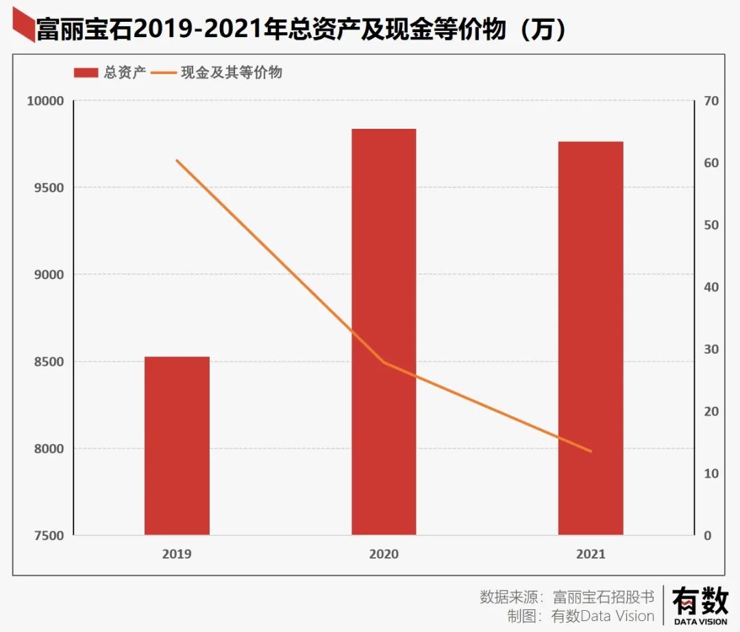 富丽宝石三年总资产分别为8525.3万,9834.6万,9763.8万,总资产增速较慢,且2021年还出现了下滑。