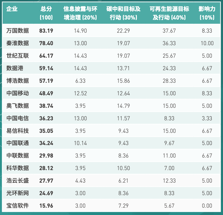 报告主要从信息披露与环境治理、碳中和目标与行动、可再生能源目标与行动、影响力四个维度对企业进行评分。