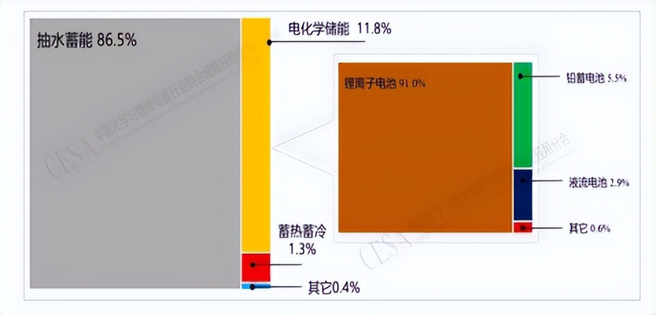 根据《2022储能产业应用研究报告》统计显示,目前中国储能市场装机功率43.44 GW,位居全球第一;其中抽水蓄能占有绝对主力优势,装机功率在37.57GW,占比86.5%;剩下不到15%的储能技术以电化学储能次之,占比11.8%,后三名是蓄热蓄冷、压缩气以及飞轮储能,合计不足5%。