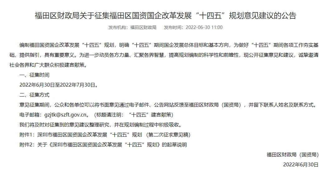 近日,福田区财政局(国资局)发布关于征集福田区国资国企改革发展“十四五”规划意见建议的公告。