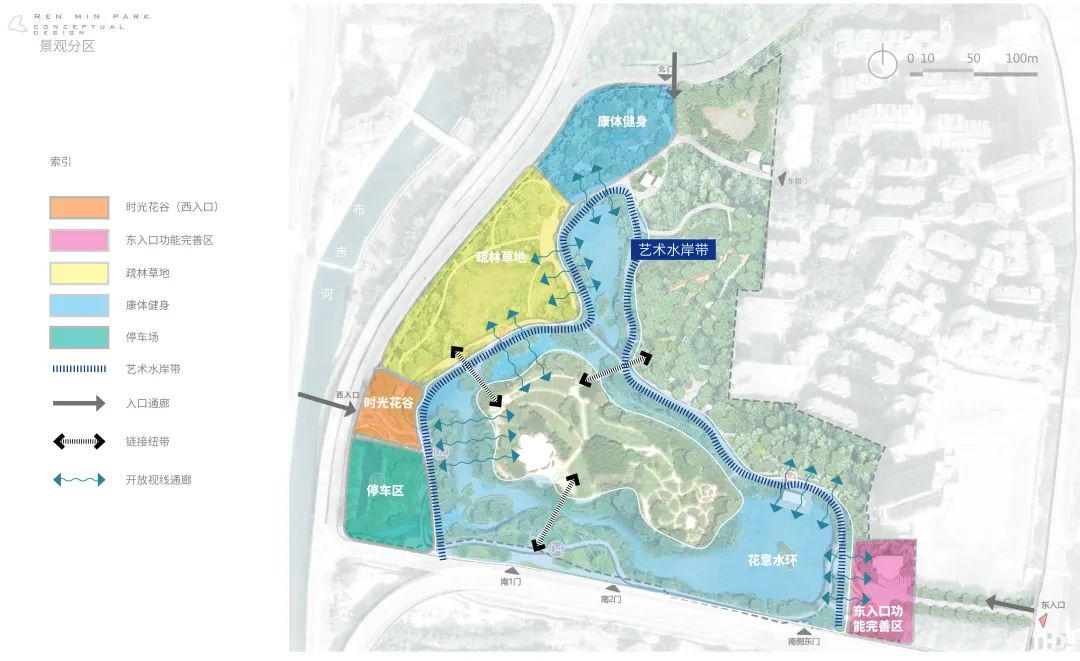 本次公园品质提升遵循生态导向设计原则,对公园进行基础设施提升、生态和功能优化,对公园园路、东西入口、水电管网系统、驳岸、标识系统等内容进行了改造升级。
