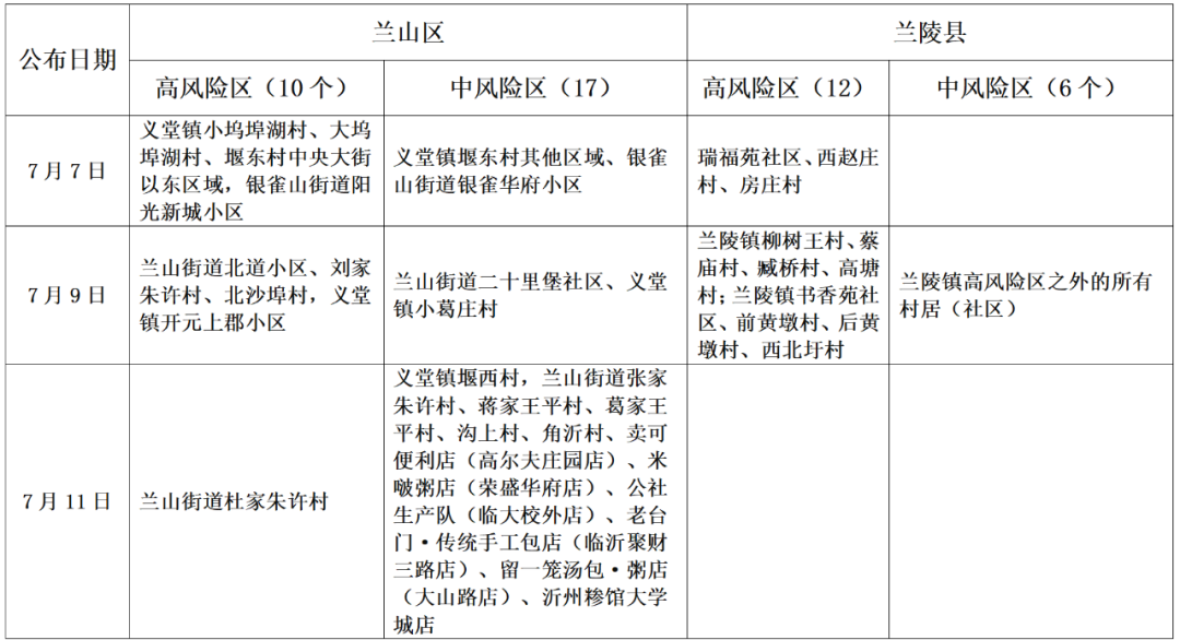 “健康临沂”微信公众号消息,山东省市疫情处置工作临沂现场指挥部发布通告,7月12日起,新增兰陵县卞庄街道幸福家园小区10号楼为高风险地区;新增兰陵县卞庄街道和平居委办公区、汶河小区、金海湾小区、翰林丽都小区,幸福家园小区10号楼之外的区域及其周边建筑附属物为中风险区。新增兰山区兰山街道董家朱许村为高风险地区。新增兰山区经济开发区后洞门河西村为中风险区。