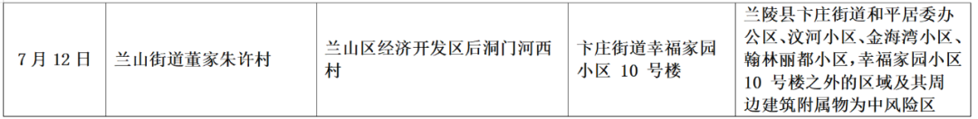 二、中风险区。新增兰陵县卞庄街道和平居委办公区、汶河小区、金海湾小区、翰林丽都小区,幸福家园小区 10 号楼之外的区域及其周边建筑附属物为中风险区。