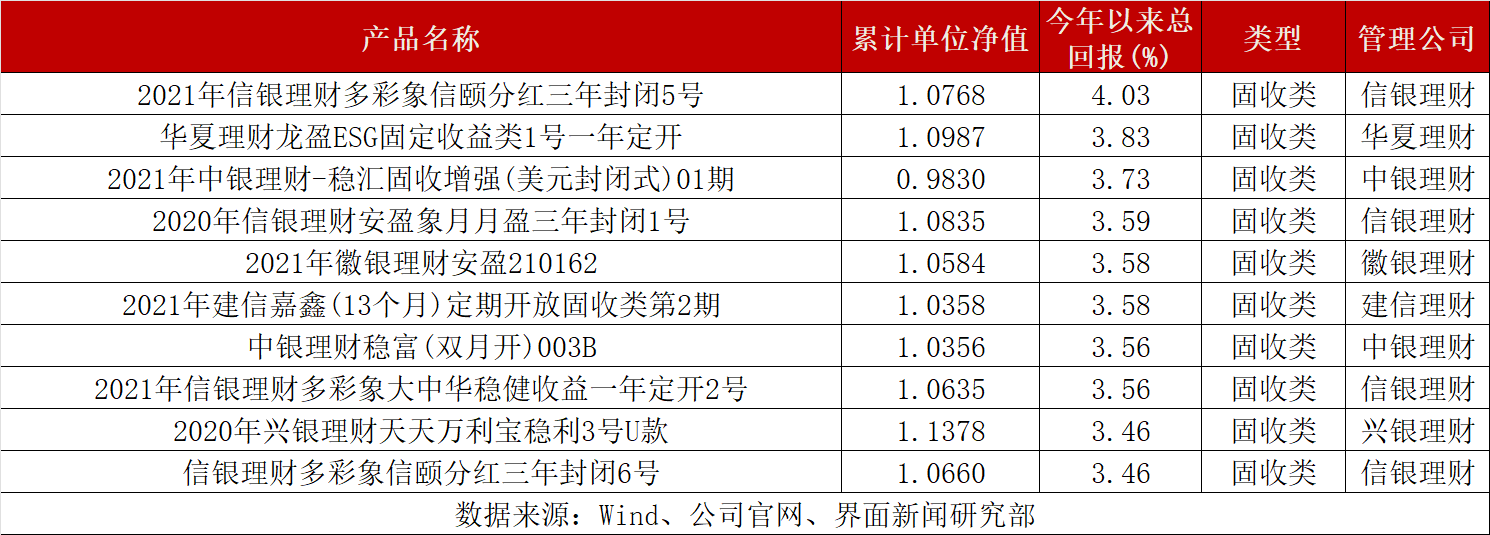 因此,界面新闻记者根据理财公司公开披露的净值数据,按照理财产品属性的不同,整理出权益类、混合类、固收类理财红黑榜。需要指出的是,部分产品仍在封闭期,区间收益率并不代表投资者到手实际收益,该榜单仅供参考。