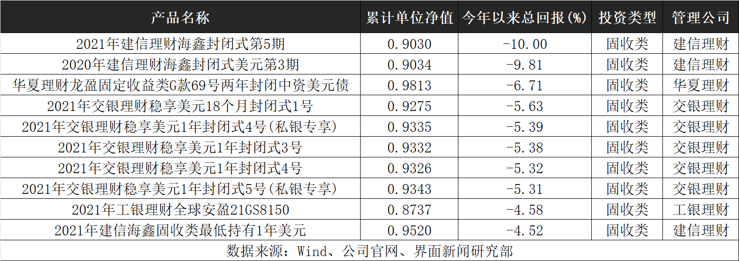 建信理财海鑫系列多只产品登上黑榜。建信理财海鑫封闭式第5期、海鑫封闭式美元第3期今年以来累计跌幅近10%。