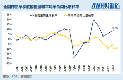 从浦银国际整理的数据来看,2022年第一季度PDB样本医院药品销售量同比增长8.7%,较2021年第四季度同比增速进一步提升;平均售价下跌5.9%,相比2021年第四季度的9.1%,跌幅亦有所收窄。第五批全国集采结果从2021年9-10月开始在各地正式执行,主要品种降价幅度较大,整体价格压力已随着时间推移逐渐减弱。