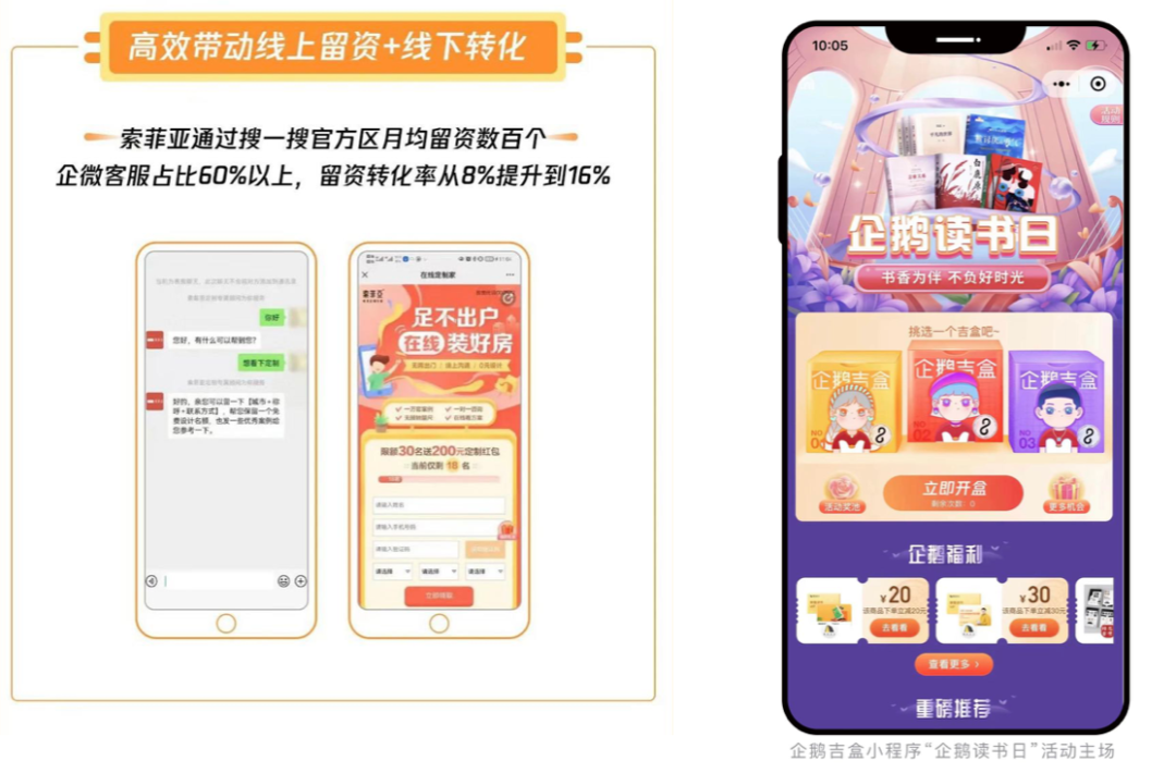 具体如何利用好这一“连接器”,腾讯广告也给出了不少率先成功的品牌案例。例如家居品牌在微信将搜一搜与其他产品打通后,承接的所有搜索流量就都流向了其公众号、视频号直播;在世界读书日,微信设置搜一搜活动专区,邀请知识类达人为活动带热度,图书类商家集中做直播带货;将搜一搜和企业微信打通,家装、摄影、汽车等转化链路较长行业里的品牌,也可以借此获得更高的留资转化率等等。