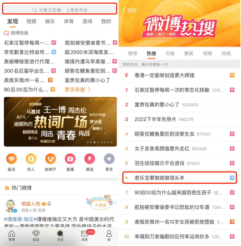 但特别的是,微博具有一定不可替代性的是热搜榜,这一产品会让用户“先搜再看”,其搜索行为会前置于信息流内容出现之前。因此,搜索与热搜榜这一产品结合也形成了更多营销玩法。