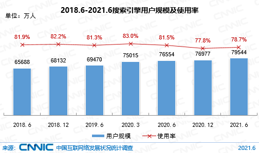 与此同时,主动搜索的用户规模如今还在稳定增长。据CNNIC报告数据显示,2020年我国搜索引擎用户规模达7.70亿人,搜索引擎使用率为77.8%;截至2021年6月,搜索引擎用户使用率较2020年12月增长2567万,使用率提升至78.7%。