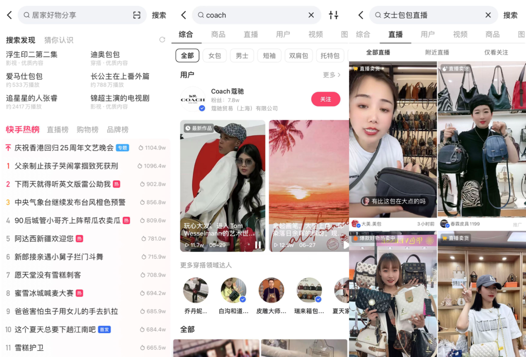 而且平台也会根据不同的节点、品牌不同的营销目标来呈现更多元素材、连接其他玩法,从而去覆盖更多有兴趣的潜力用户群体。比如在快手搜索Coach,你不仅能看到品牌官方号,还能直接看到自动播放的TVC短片,以及分享或推荐过品牌产品的时尚穿搭领域达人。