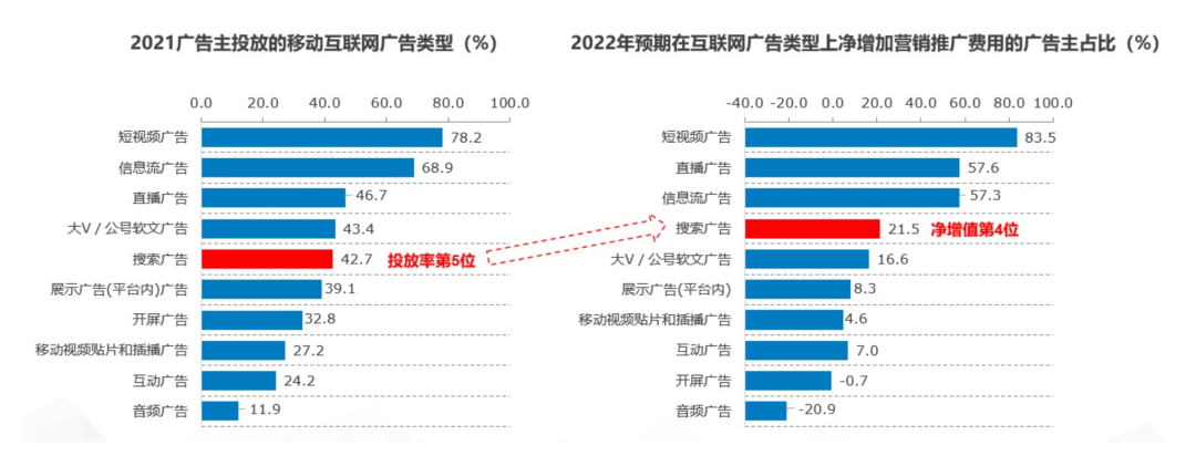 在这一背景下,行业普遍认为广告主在搜索上的预算会增加。据CTR发布的《2022年搜索营销预算趋势报告》数据,2021年移动互联网广告类型中,广告主在搜索广告的投放率位居第5位,2022年预期净增加搜索广告营销推广费用的广告主比例达21.5%。CTR认为2022年搜索广告将成为继短视频、直播、信息流广告之后的主要互联网广告投放类型。