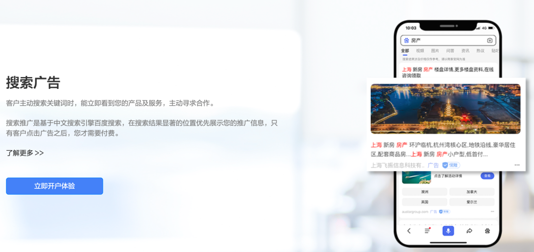 以前做搜索广告,广告主只能投放关键词,但现在广告主对于投放素材有了更多的自主选择权,可以是关键词,也可以是图片或者短视频等等,既丰富了营销创意,也更契合现在的用户内容消费偏好。