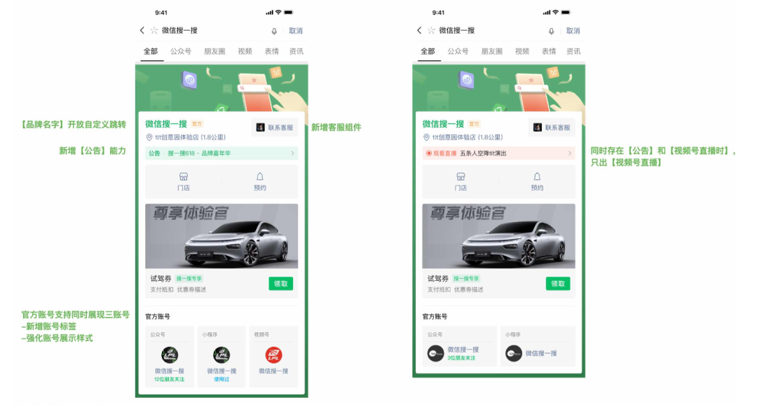 搜一搜试图打造的,是一个在微信内可最直接、简便连接起用户和品牌的路径。比如早期,在微信搜索你只能看到品牌的资讯信息;但现在搜索后可以直达品牌专区,进入品牌私域即可直接预约某项服务,也可从商家自己的店铺里搜索和购买商品等等。