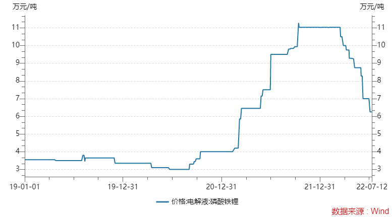 Wind数据显示,3月16日至今电解液磷酸铁锂价格已下跌超过40%,7月12日的最新报价为6.25元/吨。