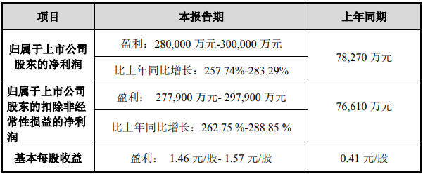“电解液二哥”新宙邦(300037.SZ)同日预计,公司上半年实现归母净利润9.83亿元至10.27亿元,同比增125%至135%。