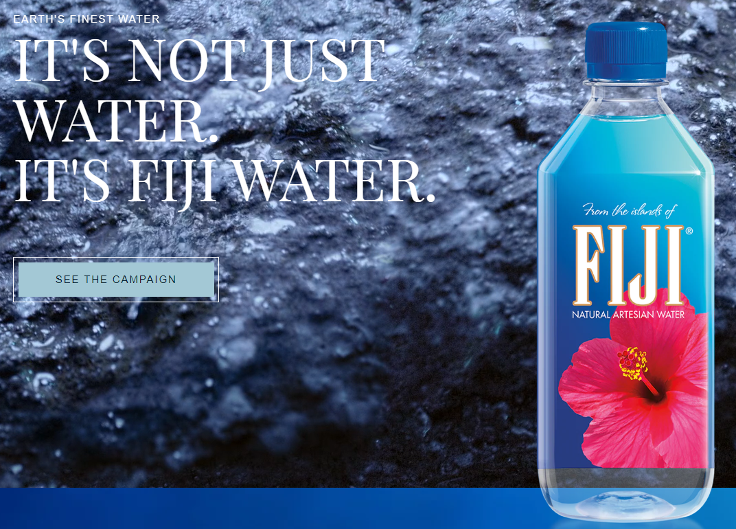FIJI斐济天然深层矿泉水一直是矿泉水排行榜的常客,广告词“不仅是水,还是斐济水”(IT'S NOT JUST WATER. IT'S FIJI WATER.),称这种热带雨林水,来自被休眠火山包围的古老自流含水层,其包装也用鲜明的撞色表达水源地的海岛特色。