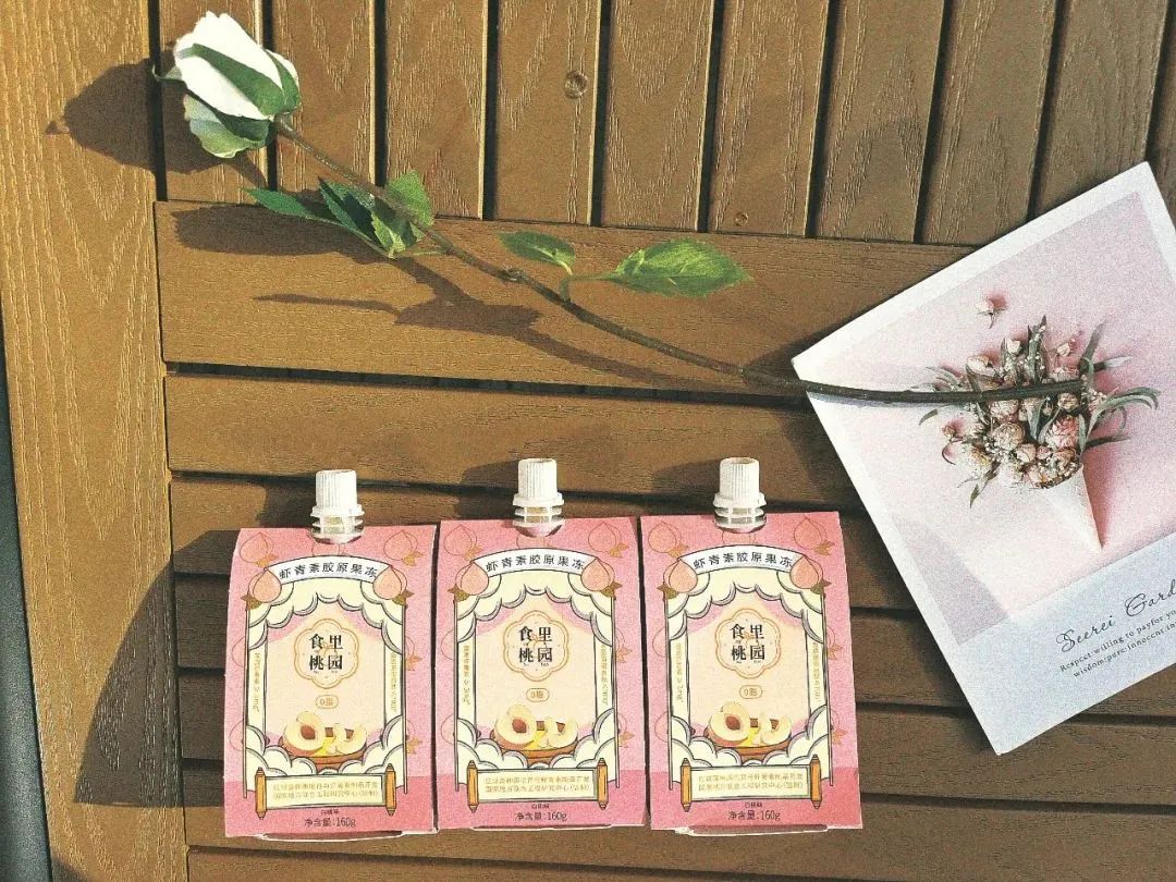 食里桃园推出的一款虾青素胶原果冻。据悉,每袋果冻添加有3mg提取自天然雨生红球藻的虾青素,20mg的维生素C与小分子形态的鱼胶原蛋白肽,选取白桃作为原汁,不另外添加蔗糖,热量约为87.15卡路里。