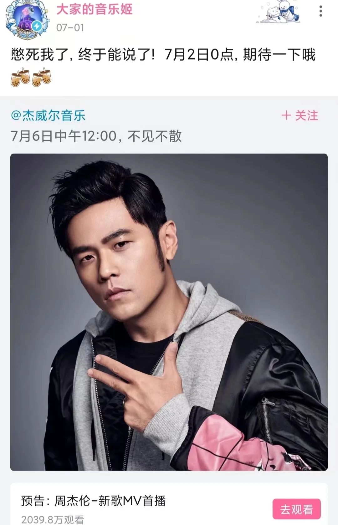 7月6日中午12点,周杰伦新专辑发布了第一波主打歌MV,上线仅1小时47分钟播放总次数突破600万次,分享总次数突破20万次,评论总次数突破12万次。“周杰伦”现象级话题霸榜多个微博热搜第一。