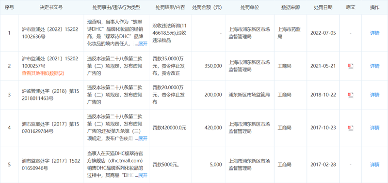 据天眼查官网信息披露,日本DHC品牌的国内经销商“上海蝶翠诗商业有限公司”(以下称DHC蝶翠诗)于7月5日被上海市浦东新区市场监督管理局罚没近115万元。
