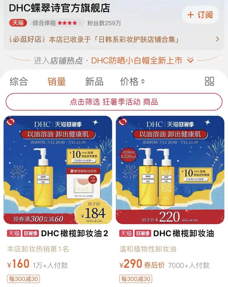 而在中国的天猫平台上,DHC蝶翠诗官方旗舰店的粉丝数已达259w,产品单价在18元-650元不等,销量最高的产品为DHC橄榄卸妆油,月销为1w+,看起来品牌业务还是很不错的。