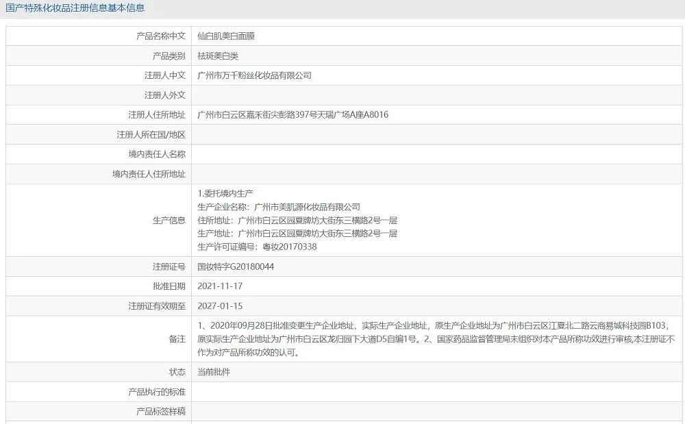仙白肌美白面膜注册信息(截图自药监局官网)