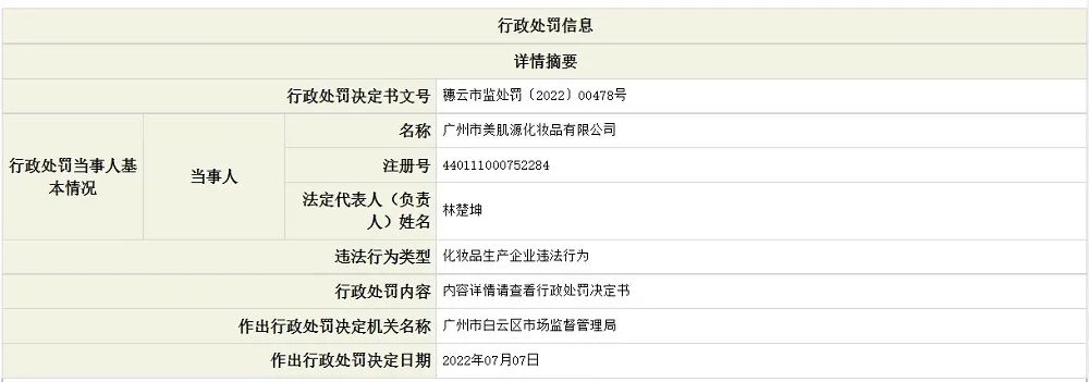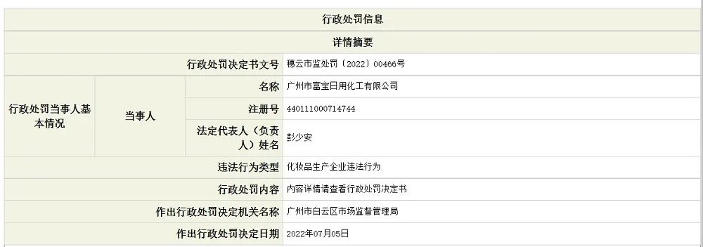 而在另一则行政处罚信息中,广州市富宝日用化工有限公司(以下简称“富宝日化”)也因为受到美肌源的委托,生产标签虚假和引人误解的化妆品行为被罚款1.2万元。