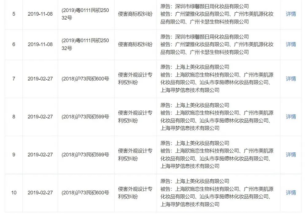 爱企查官网显示,2019年期间,该公司涉及多起与化妆品相关的侵害商标权、侵害外观设计专利权的纠纷。