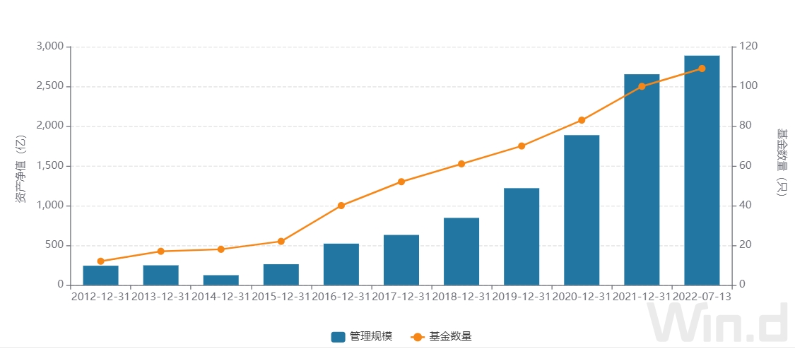 截至目前,万家基金旗下共管理109只基金产品,管理规模2886.95亿元,较2021年年末增长234.31亿元,同比增幅8.83%。其中,货币市场型基金占比38.41%。