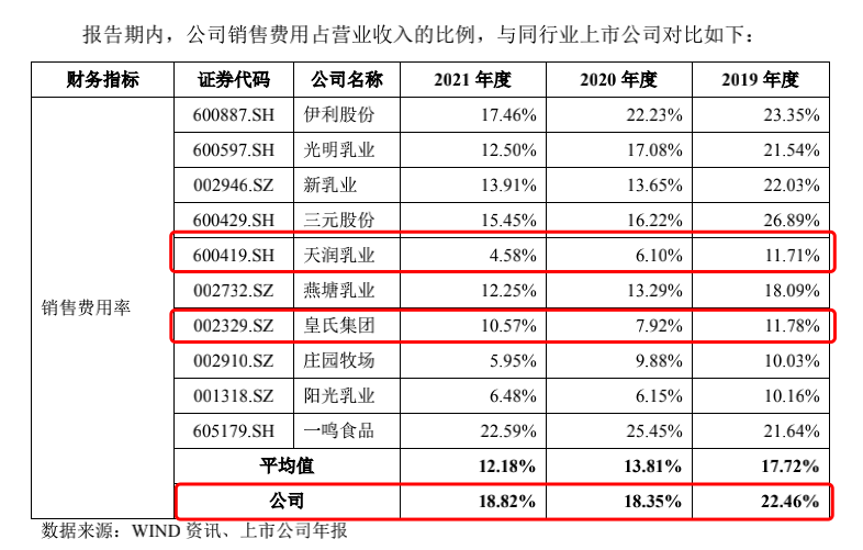 2019年到2021年,认养一头牛销售费用分别为1.94亿、3.03亿、4.83亿,销售费用率分别为22.46%、18.35%、18.82%;同期,A股上市乳企的平均销售费用率为17.72%、13.81%、12.18%。