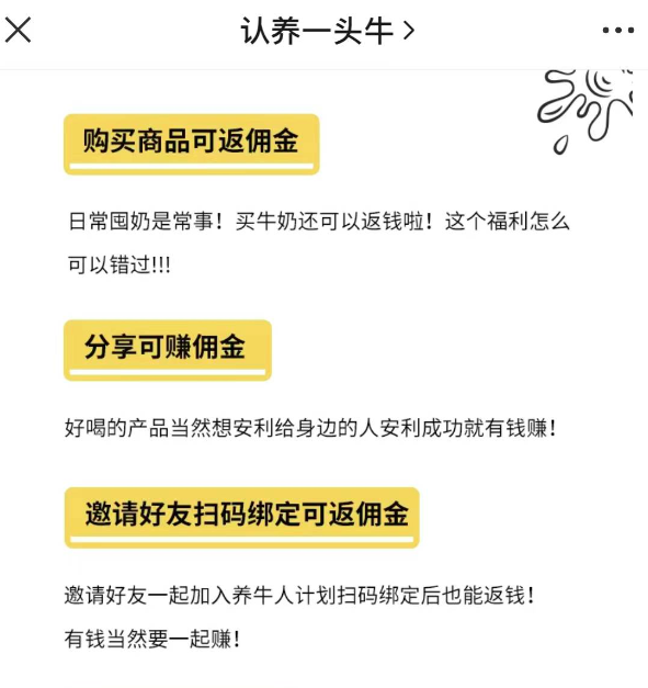 认养一头牛另一个争议点是2020年推出的“养牛人招募计划”,具体包括“购买商品可返佣金”“分享可赚佣金”“邀请好友扫码绑定可返佣金”等活动。