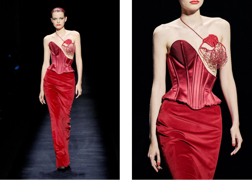 大秀上压轴登场的是一件血红色心脏高定礼服,Daniel Roseberry将心脏与血管融入设计当中,搭配上令人无法转移视线的正红色,就宛若一朵盛放的红玫瑰。
