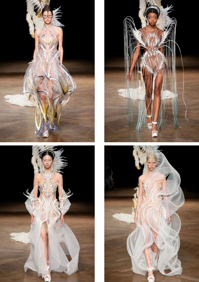 这一次设计师仍然秉持着对线条的极致追求,继续将科技与时尚的结合,用3D打印技术将面料完美贴合身体曲线,展现出每一位穿衣者优美的身型。在面料方面更是利用丝绸将服饰打造出轻薄飘逸的造型,在未来感十足的设计风格中,增添了几分梦幻感。